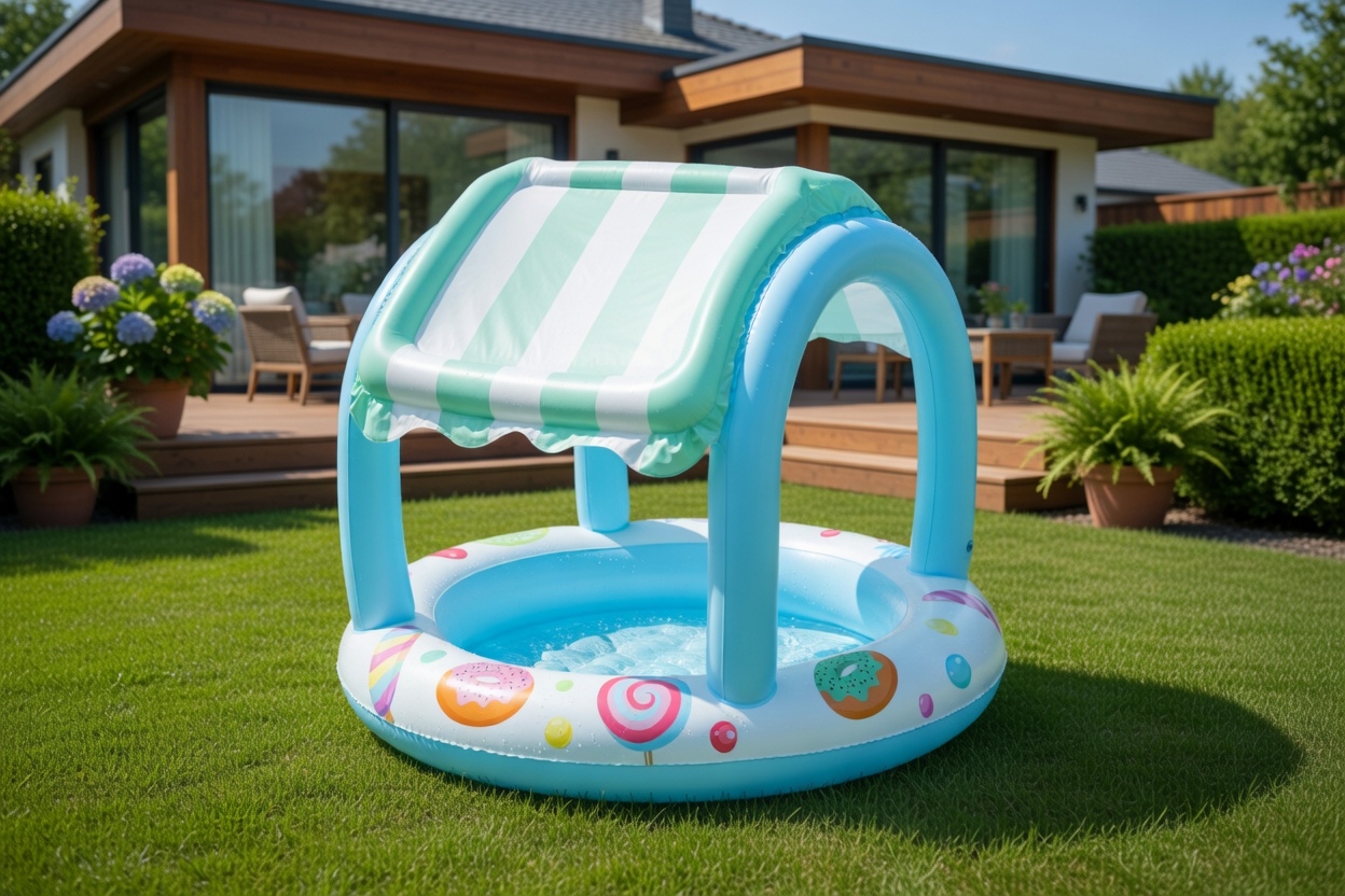 Бассейн Bestway SWEET SHOPPE (52638) для детей до 3 лет с тентом, который защищает от солнца. В комплекте — мягкие стенки, встроенные игрушки и легкость в установке. Идеально для безопасного и веселого купания малышей.